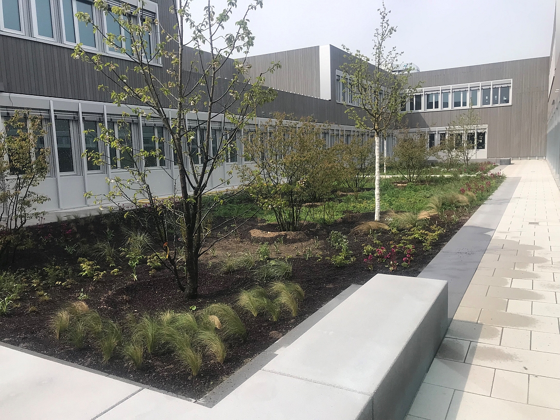 Landschaftsbauarbeiten und Pflanzungen für einen Schulhausneubau